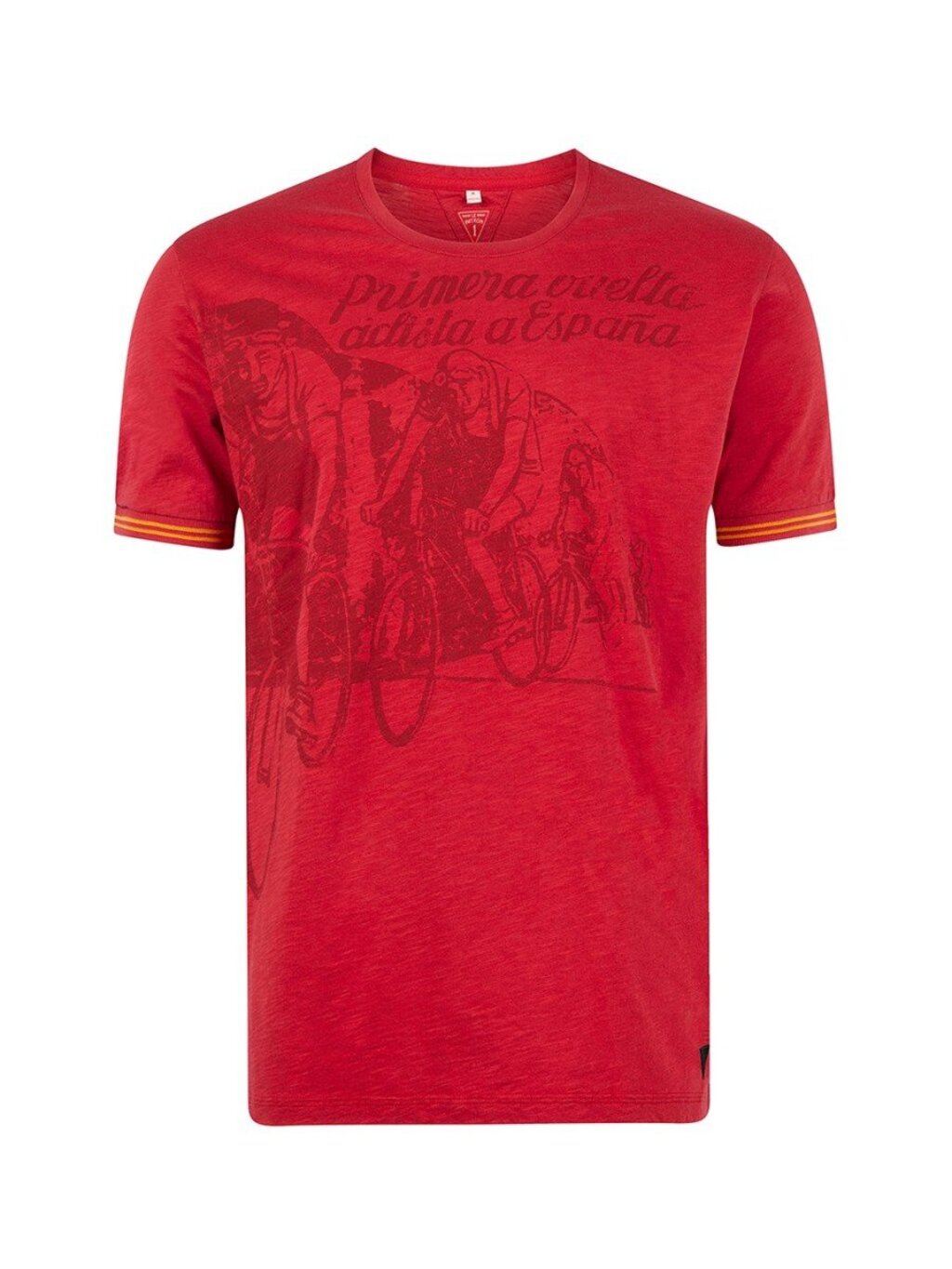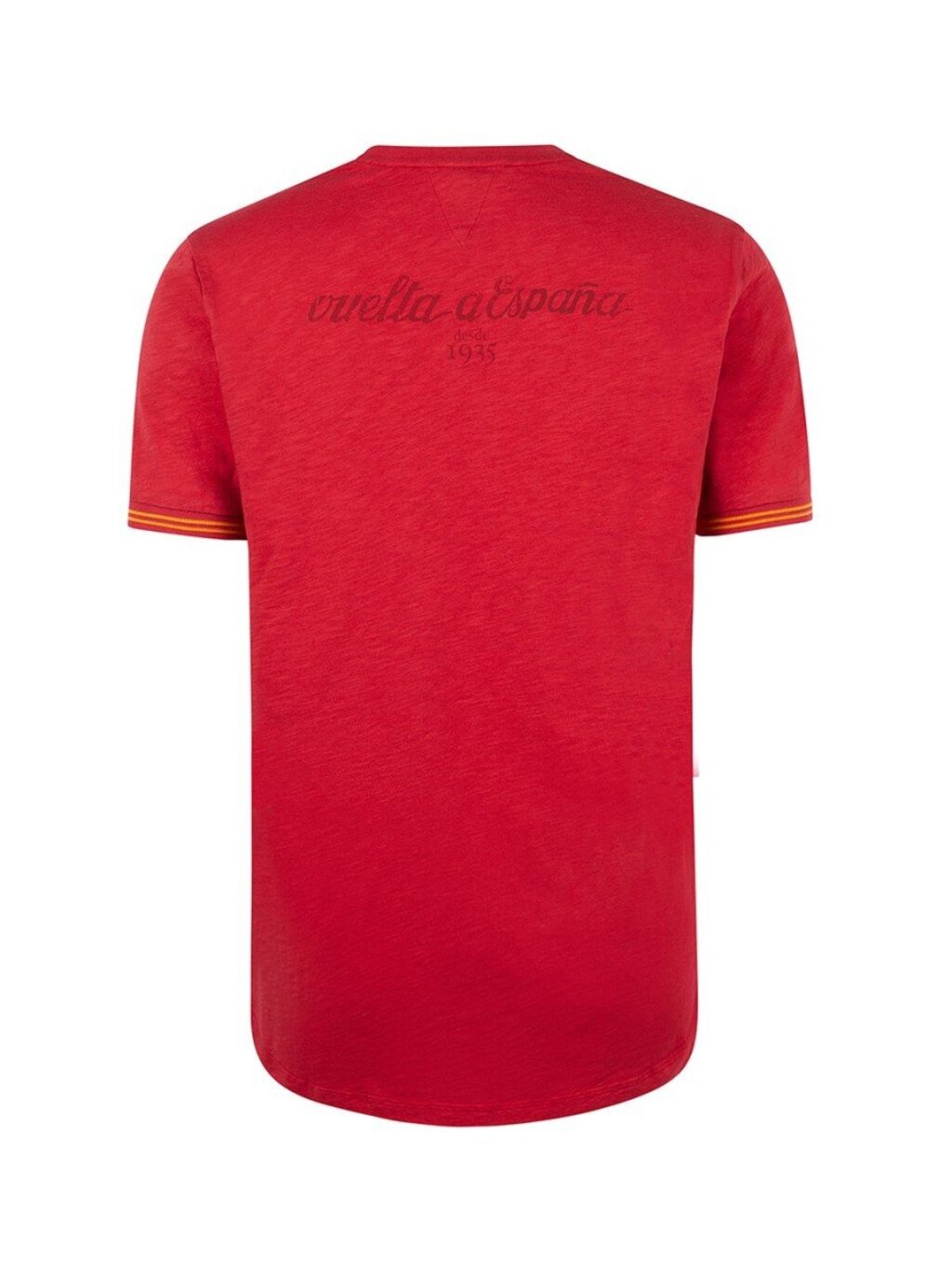 Een premium T-shirt in de opvallende rode kleur van La Vuelta. We hebben een print geselecteerd die werd gebruikt om de eerste La Vuelta in 1935 te promoten. Het T-shirt is gemaakt van zachte slub jersey, wat het een coole en casual uitstraling geeft. Als je gepassioneerd bent over wielrennen, draag dan de kleur van passie. 100% katoen slub jersey Vuelta-rood Gemaakt in Portugal Nostalgische La Vuelta print Gestreepte mouwafwerking in Spaanse kleuren Iets langere en afgeronde achterkant, geïnspireerd op een fietstrui Rubberen Le Patron label op de voorkant Machinewas op 30º, wassen met soortgelijke kleuren Niet in de droger
